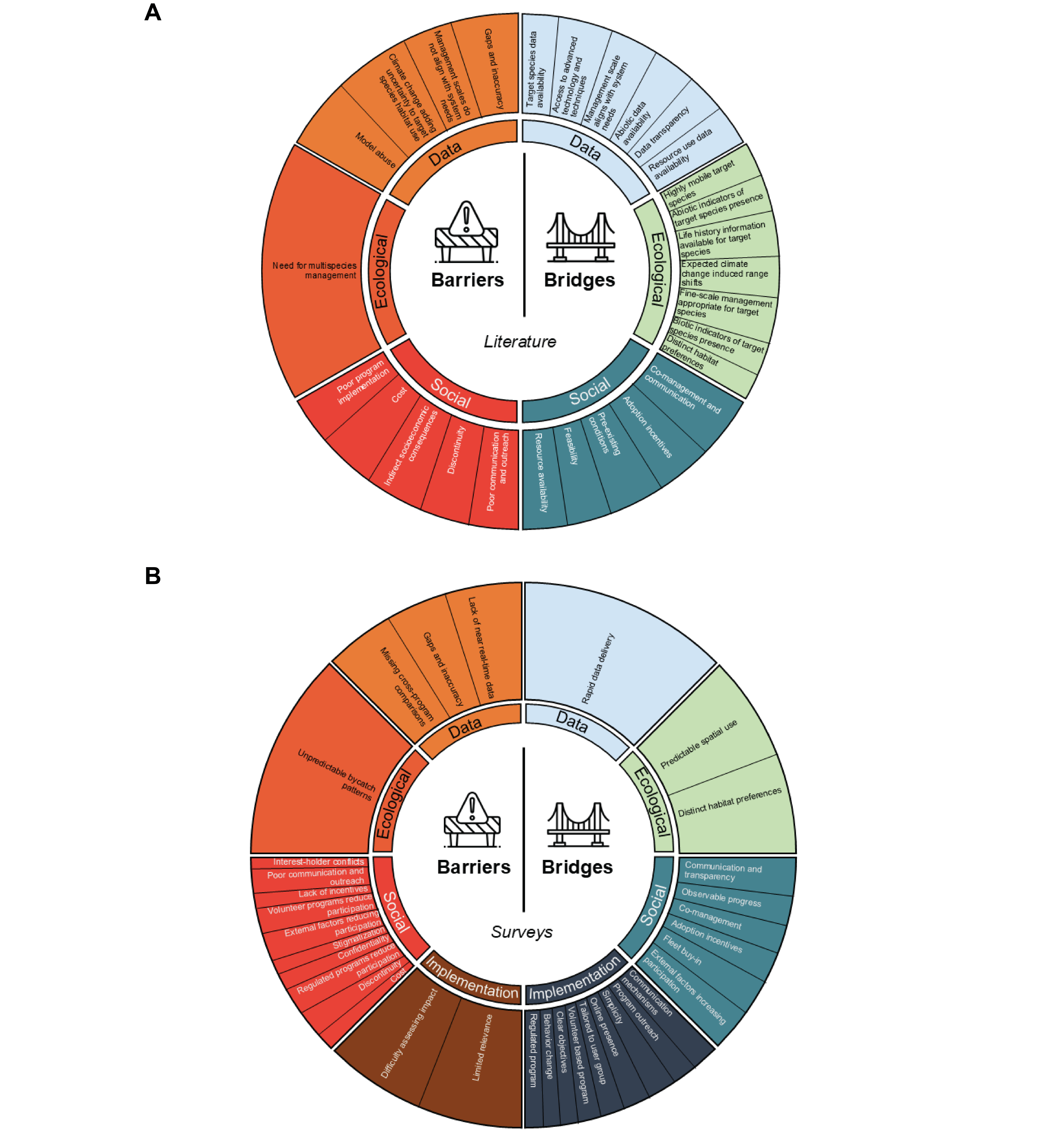 Quarto page summarizing analysis from dissertation research investigating the bridges and barriers to dynamic ocean management through a systematic literature review and end-user surveys.